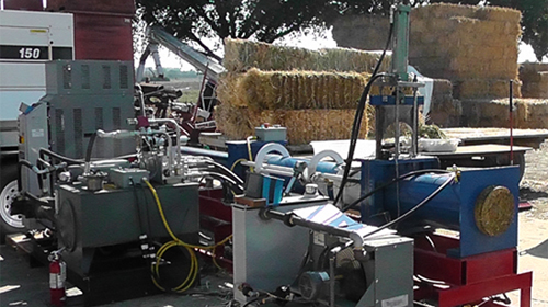 Altex has developed, with the support of DOE, a biomass densification process, called BBADS, that reduces cost by 76% and 84% relative to conventional pelletization and cubing approaches. This field demonstrated system pictured below creates compact biomass logs, shown in the right of the picture, that are ready to be shipped economically to biorefinery sites. These sites can now be located significant distances from the dispersed sites where the biomass is grown. This allows the construction of fewer and larger biorefineries that will then lower the cost of biofuels production, making these biofuels competitive with fossil fuels. To date, BBADS has successfully densified a wide range of materials, including switchgrass, miscanthus, wheat straw, corn stover, and alfalfa, with some examples pictured below on the right. Densities as high as 50lb/cf are possible with BBADS—see the examples below